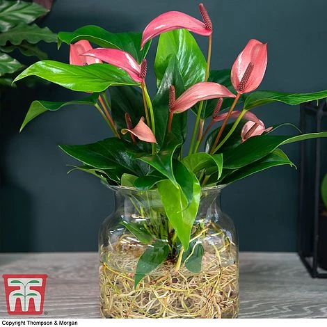 Simple and stylish, this elegant Anthurium comes in a clear glass vase, allowing you to admire its twining network of roots. This eye-catching soiless display makes a fascinating focal point that captures the latest trend for hydroponic house plants. This bareroot Anthurium is easy to grow – simply unpack the plant when it arrives and just add water! With its glossy evergreen foliage and showy pink flowers, this beautiful perennial makes a sophisticated gift that will last far longer than a bouquet of cut flowers. Height and spread: 45cm (18″).