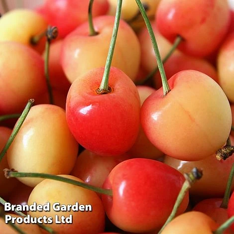 Known as a ‘white cherry’ due to the pale colour of the flesh, Cherry ‘Bigarreau Napolean’ bears large, yellow fruit which becomes blushed with red in the sun. The fruit is firm and well-flavoured with a sweet/sharp tangy taste, different to the sugary dark red cherries. Cherries don’t store for long and taste best freshly picked – but Bigarreau has the benefit of a long ripening period, allowing you to make several pickings. Height and spread after 10 years: 2.5–4 metres (8ft-13ft)