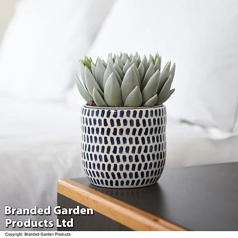 A fun present for kids and adults – this is a real live Echeveria which glows in the dark! Echeveria ‘Miranda Glow in the Dark’ has been treated with a harmless coat of luminous paint. Its neat rosette of fleshy leaves lights up like a star at night making a fun feature for shelves, windowsills or tables. It’s ideal as a little night light for children’s bedrooms. This Echeveria is also incredibly easy for children to look after as it requires very little water and looks great all year round. As the plant grows, new leaves in the centre of the rosette will emerge green whilst the outer ones will retain their luminous properties. Height and spread: 10-20cm (4-8in).