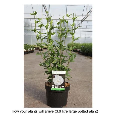 Large, single, pure-white flowers are borne in late summer on this wonderful deciduous shrub, with five large outer petals surrounding a centre of small, petaloid stamens. Lobed, dark green foliage provides the perfect backdrop to Hibiscus syriacus ‘White Chiffon’, whether placed in a patio container or in a mixed shrub border. There’s no surprise that this shrub has been awarded a prestigious RHS Award of Garden Merit. Height: 3m (10′). Spread: 2.5m (8′).