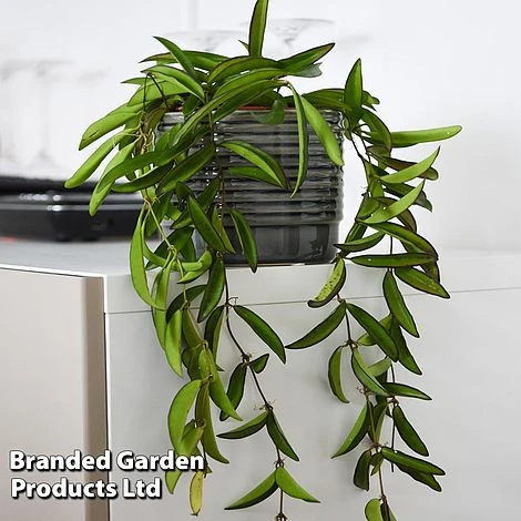 Boasting gently tumbling stems of elegantly pointed green leaves, each with a dark red edge, Hoya wayetii makes a beautiful hanging houseplant to bring a calming and exotic feel to any room. Given enough light, it will produce clusters of sweetly scented burgundy flowers. One of the easiest hoyas to grow, this wax flower will thrive in a bright spot. A little direct sunlight in the morning or evening will encourage flowers to form. Height: 120cm (47in). Spread: 40cm (16in).