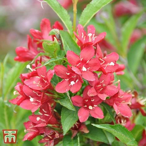 Weigela ‘Nain Rouge’ has a dwarf rounded habit with gently cascading branches that are covered in bloom from May to June. The bright red tubular flowers stand out beautifully against the dense, dark green foliage. As summer ends, this dwarf deciduous shrub turns to autumn shades of red and orange in a final burst of colour. Compact and easy to grow in containers, borders or at the edge of woodland plantings. Height and spread: 90cm (36″).